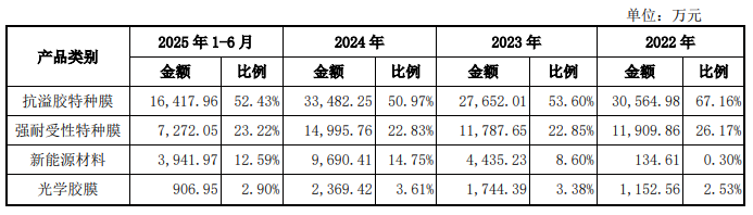 公司自2004 年设立以来,始终坚持“自主创新、进口替代”的技术发展路线,经过 20 年的发展,公司不仅陆续打破了欧美日韩企业在抗溢胶特种膜、强耐受性特种膜等产品上的技术垄断,而且成功发展成为相关产品全国市场占有率第一的厂商,确立了公司在相关领域的行业地位。2010 年以前,由于抗溢胶特种膜的材料配方、加工工艺等具备较高的技术壁垒,国内厂商基本没有成熟技术,因此市场主要由日本三井化学、住友化学及积水化学三家公司垄断,国内客户普遍面临因供应商单一造成的材料供给问题。新广益是当时行业中较早发现上述产业短板的企业之一,为把握抗溢胶特种膜国产替代潜在市场的发展契机、响应国家关于发展高性能特种薄膜产业的号召,公司自 2006 年起就成立了技术攻关专项小组,通过不断地自主研发和技术积累,最终于 2010 年成功研发出与国外竞争对手性能可比的抗溢胶特种膜,成为了国内少数几家掌握抗溢胶特种膜关键制备技术的厂商之一。随后几年,公司持续进行技术升级和工艺迭代,产品性能不断提高、产品类型逐渐丰富、市场占有率稳步提升,陆续与全球排名前 10 的多家 FPC 厂商建立了深入合作关系,成为了鹏鼎控股、维信电子、紫翔电子等全球知名客户抗溢胶特种膜的重要供应商。目前,公司已成为抗溢胶特种膜的国内细分龙头厂商,市场占有率位居全国第一。新广益在推进前述产品国产化的工作过程中发现强耐受性特种膜的国产化率同样较低。强耐受性特种膜是一种应用于高温、高湿、强酸碱、强外部应力等极端恶劣生产环境中的高性能薄膜产品,由于具有较高技术壁垒,当时市场基本被日本的索尼、凡纳克(PANAC)、索马龙(SOMAR)等公司垄断。针对上述国产替代的产业发展机遇,公司于 2007 年成立技术攻关小组,专注强耐受性特种膜产品及工艺的自主研发。考虑到产品对耐高温高湿、耐强酸强碱、抗强外部应力等关键理化指标的严苛要求,公司将材料配方与关键制剂研发、多膜复合技术与关键生产工艺作为技术研发的突破口,通过在高分子材料之间的重构合成与改性、大分子聚合物间桥梁小分子的筛选与验证、多层异构材料高强度复合成型、精密高分子涂布工艺控制等方面的深入研发,最终于 2012 年成功研发出第一代具有竞争力的成熟产品。随后几年,公司不断进行技术优化 及工艺升级,在产品性能持续提升的同时,市场占有率稳步提高。目前,公司不仅成 为了鹏鼎控股、维信电子、紫翔电子等全球知名柔性线路板厂商强耐受性特种膜的重 要供应商,打破了国外竞争对手的技术和市场垄断。除了在柔性线路板产业链中持续 创新发展外,新广益也在其他高性能特种薄膜领域不断寻求自我革新及技术突破的机 会。声学膜是耳机中起发声功能的核心材料,它是一种能够随电流驱动产生不同幅度 形变,通过高频震动带动周围空气传递出声音的薄膜,其声学性能决定了发声单元的 各种声学参数(振动质量、瞬态、失真和频响),因此声学膜是耳机中最重要的基础 性材料之一,属于电子产品组件材料。从生产制造的技术难点看,由于声学行业对耳 机降噪功能、谐振频率(声学性能)、耐候性的要求越来越高,导致声学膜的厚度公 差、模量公差、结晶温度、拉伸强度、断裂伸长率、蠕变性、耐水解性等性能指标均 会对耳机的音质造成较大影响,而传统生产技术较难对各个关键指标予以精准控制。 由于存在上述门槛,2020 年以前全球高端声学膜技术主要由日本的 SHEEDOM、MATAI、 奥地利的 ISOVOLTA 等少数公司掌握。2018 年,新广益发现上述产业痛点以后,敏锐地 意识到声学膜的制造难点在于不同分子量聚合物弹性模量的调节控制、精密制程工艺 控制、声学薄膜特种制造设备的专业化配套等,而公司多年在流延成膜、高分子模量 调节技术等方面已经形成了较多积累,公司有望在原有技术储备的基础上,通过材料 改性优化设计、关键设备及工艺的改进创新等措施实现声学膜的技术突破。因此,公 司迅速组成技术攻关小组,通过近一年的专项研发,成功制备出厚度公差小(±1um)、 模量公差小(±3Mpa)、耐温性能优异(高温 200℃、低温-30℃)的高精度声学膜, 在核心技术指标超越国外同类产品的同时,实现了中国技术在声学膜领域的自主突破。 目前公司声学膜已经通过对歌尔声学的销售,实现了对苹果高端耳机产品声学膜材料的配套。